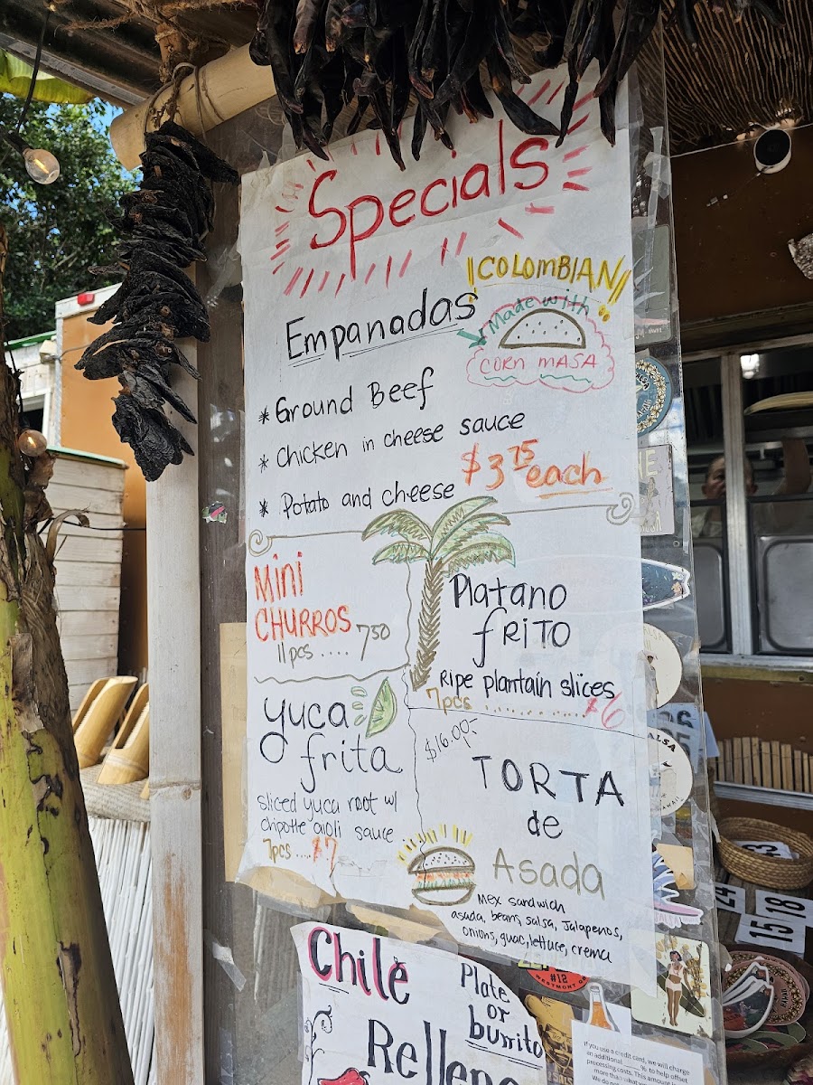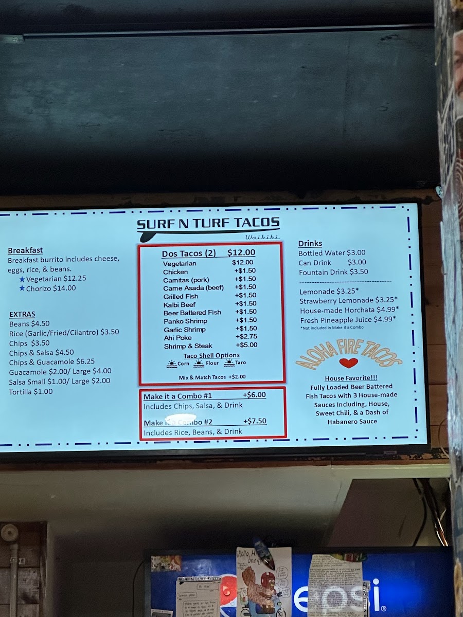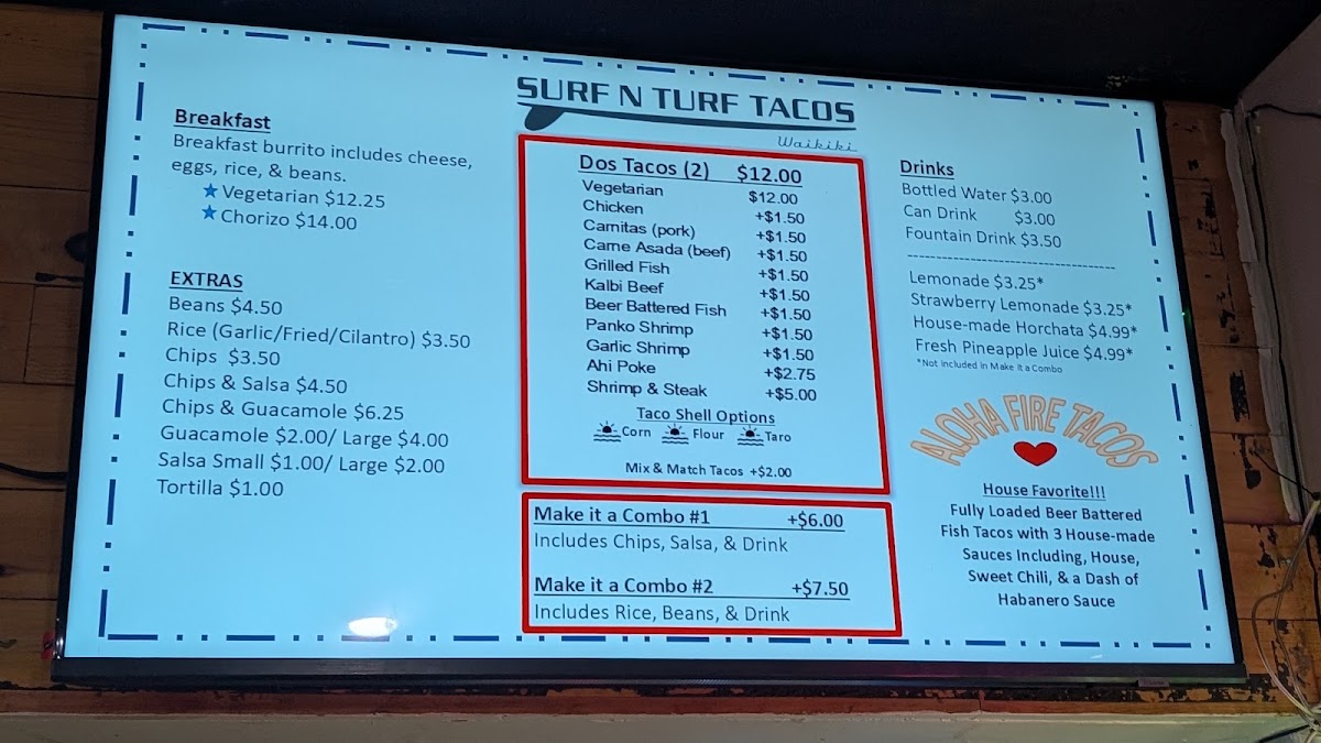 Drinks include large fountain drinks, fresh horchata—a traditional dessert drink made with sweet rice, milk, cinnamon, and nutmeg—and fresh pineapple juice, a local Hawaiian blend.