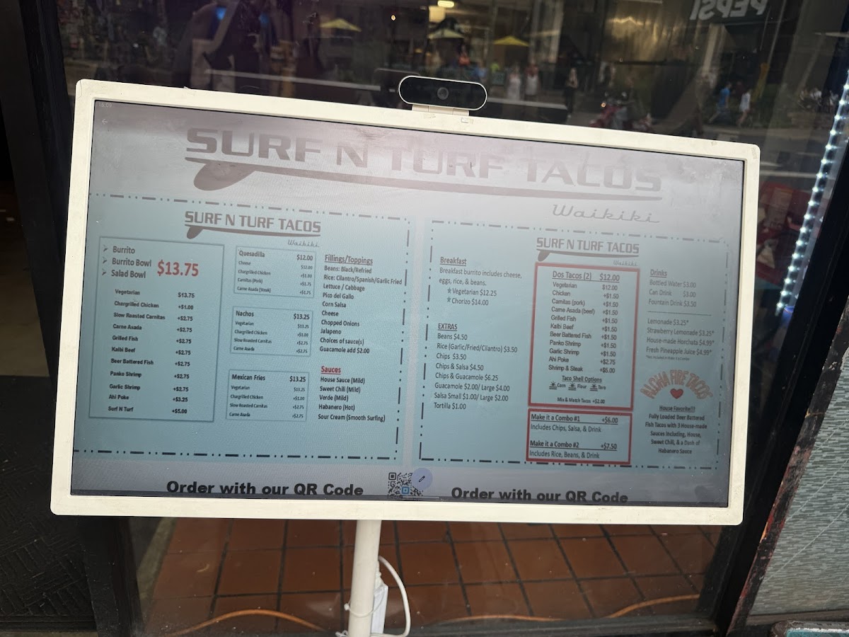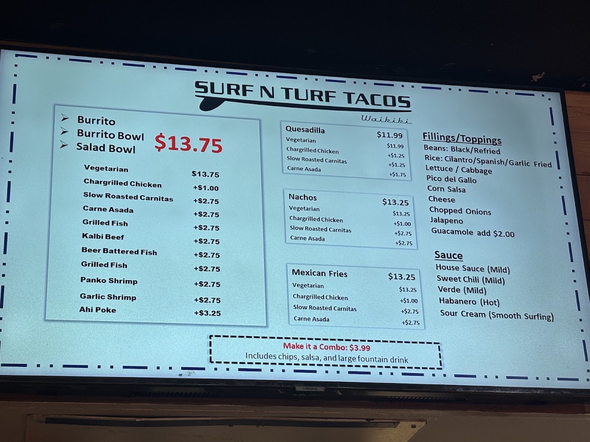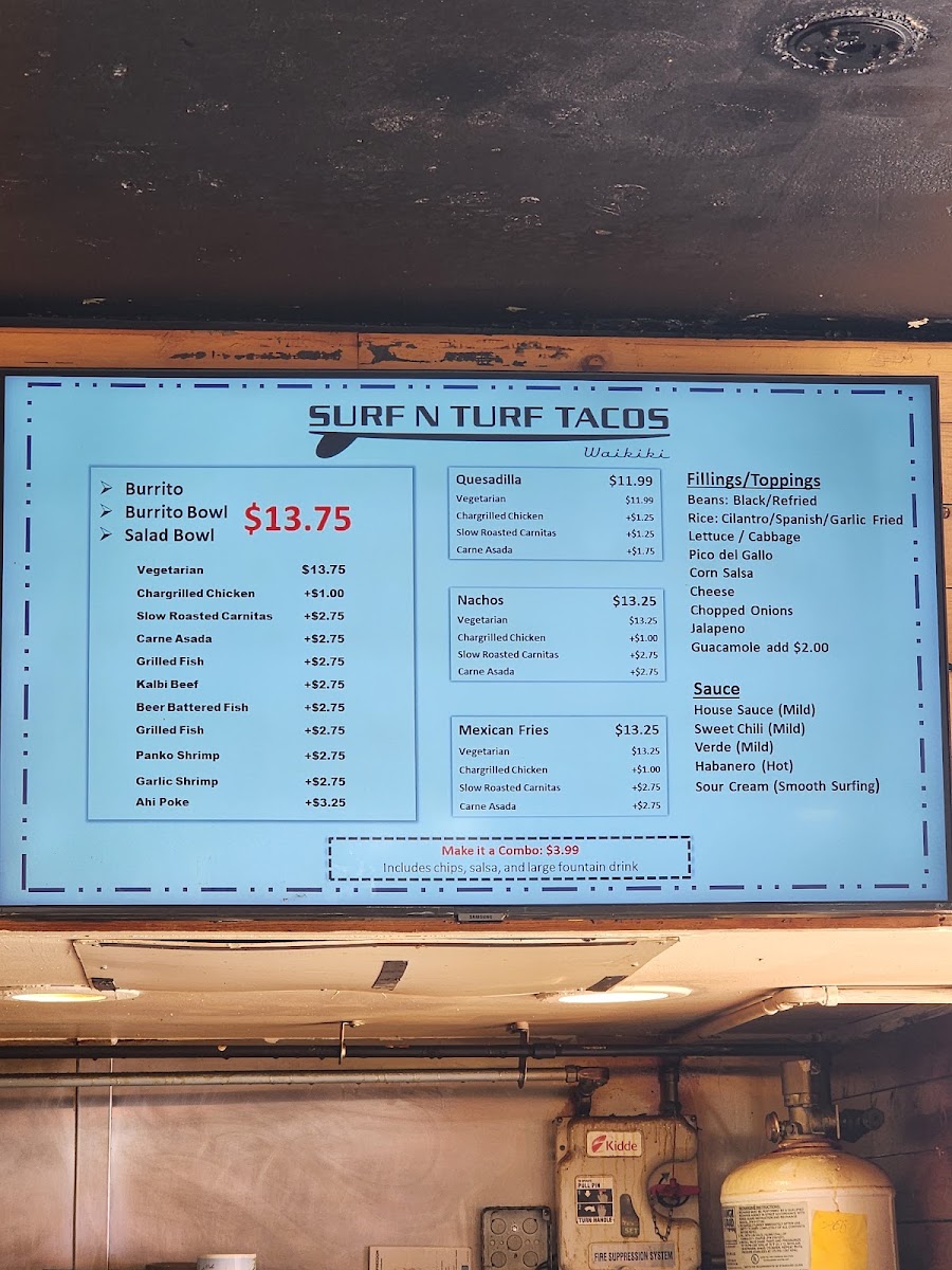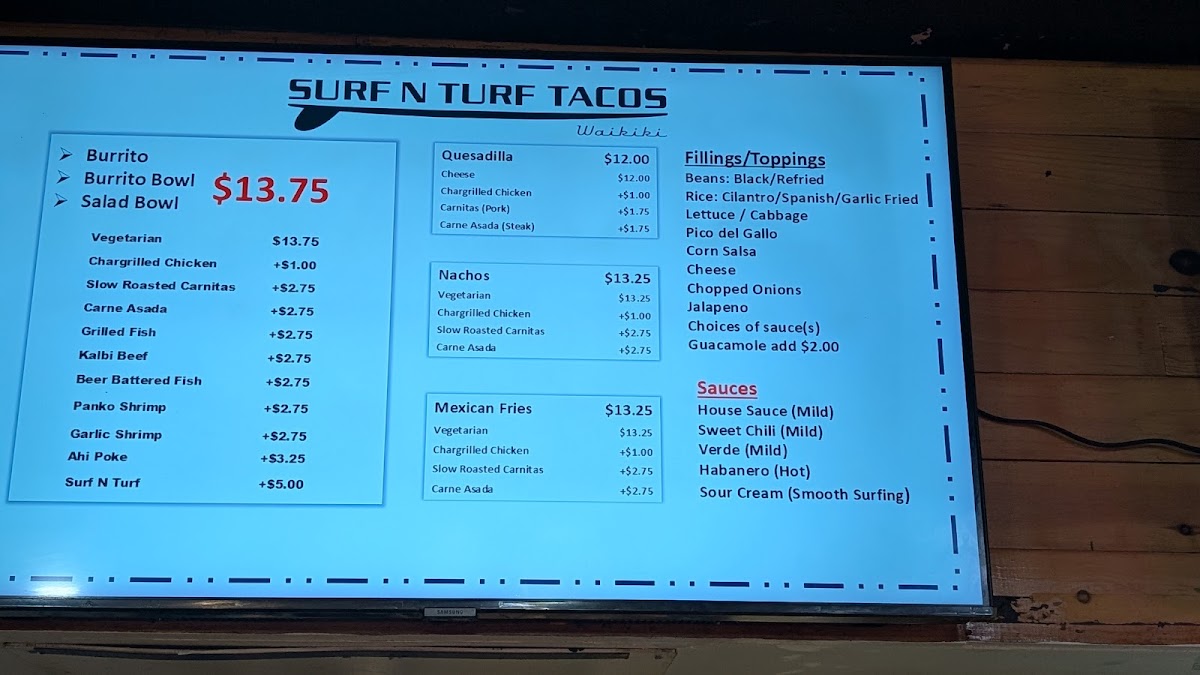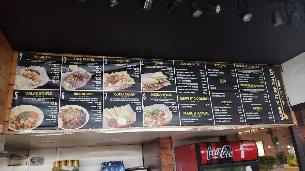 The menu at Surf N Turf Tacos features a blend of Hawaiian and Mexican cuisine, offering a variety of tacos, burritos, tortas, and other dishes. It is organized into several groups including all-day food options and drinks.