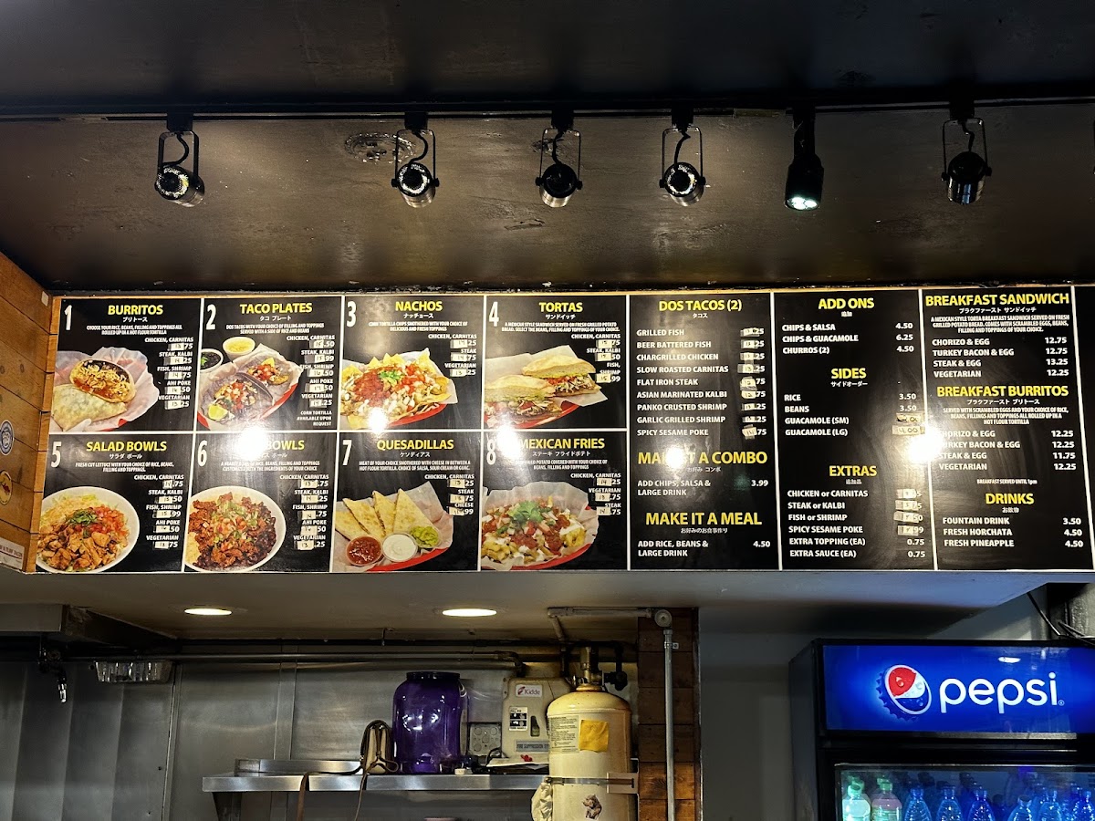 Additional menu highlights include fried fish, burrito bowls, various tacos such as chicken, grilled garlic shrimp, steak and kalbi, kalbi beef on taro tortillas, and vegetarian nachos. Side items like chipotle aioli and popcorn are also part of the selection.